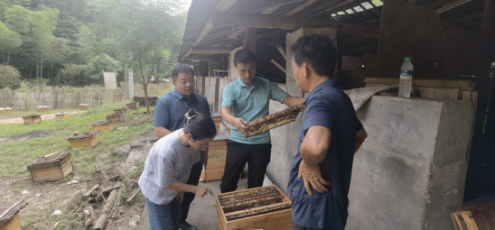 7月12-13日,国家蜂产业技术体系南昌综合试验站科技人员前往武宁县两个中蜂示范蜂场调研多箱体成熟蜜生产。
