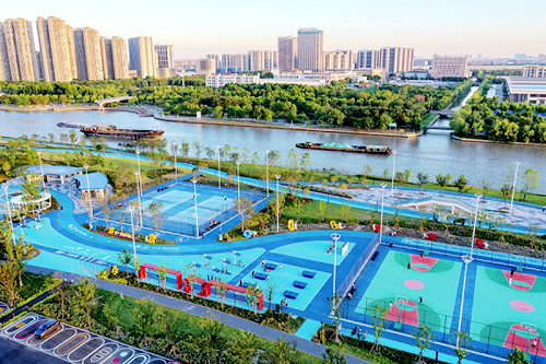 江苏省南通市通州区通吕运河整治项目连续两年被通州区列为民生实事项目,建成的4大功能区基本覆盖所有年龄段人群的运动休闲需求,包含运河北岸公园在内的通吕运河(通州段)首条绿色运河生态长廊,已经成为市民健身、休闲游乐的好去处。图为通吕运河北岸公园。